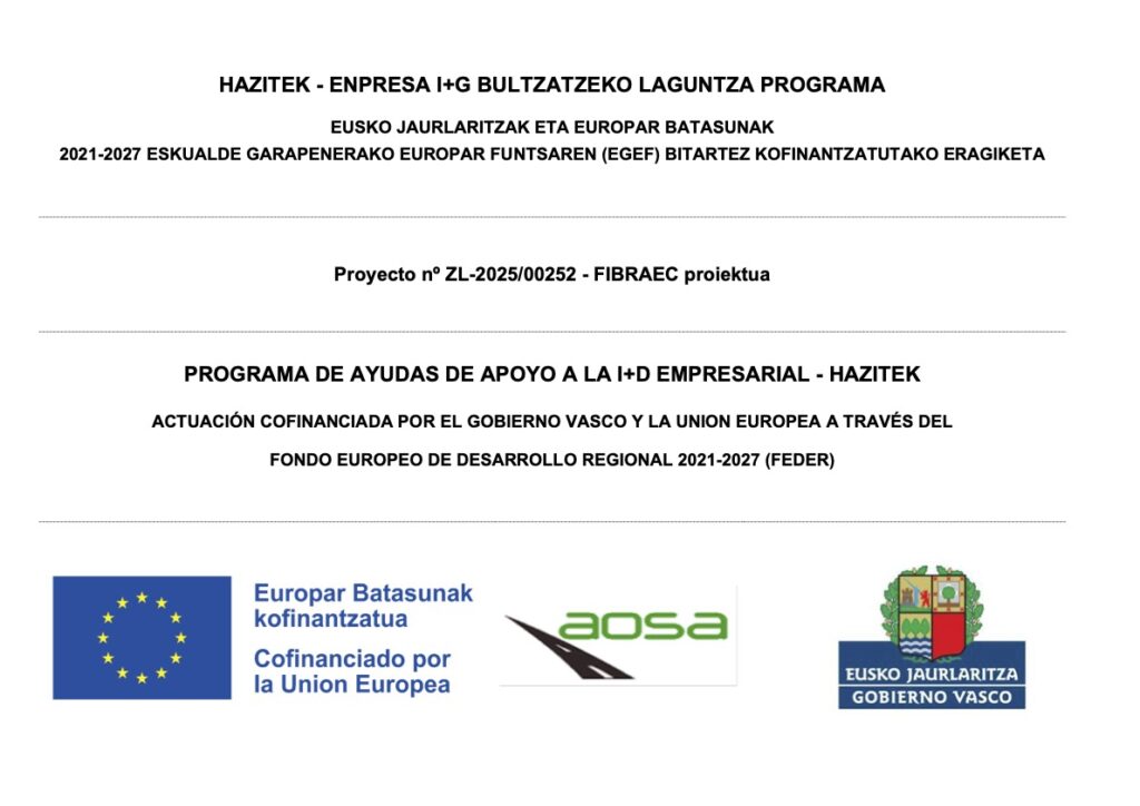 El proyecto FIBRAEC tiene como objetivo investigar y desarrollar un proceso de transformación de residuos textiles de poliéster (de difícil reciclabilidad y de origen preconsumo que actualmente se depositan en vertederos) en fibras textiles de alto valor añadido, que serán utilizadas como materia prima aprovechable en la fabricación de nuevos productos, promoviendo la valorización material de los residuos textiles y su economía circular (Concepto Fiber2Fiber). Asimismo, se explorarán casos de uso, para las fibras de PET obtenidas, en el sector AEC (arquitectura, ingeniería y construcción) y se abordará la investigación y desarrollo de nuevas formulaciones para asfaltos, hormigones y morteros, consiguiendo diversificar su aplicabilidad, actualmente centrada en el sector de la automoción. Este proyecto ha sido objeto de ayuda con cargo al presupuesto de gastos del Departamento de Desarrollo Económico, Sostenibilidad y Medio Ambiente del Gobierno Vasco y cofinanciado por la Unión Europea a través del FEDER (ZL-2023/00772).